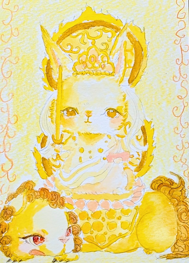 智慧と優しさを象った優しい光をあなたへ 卯年の守り本尊、文殊菩薩様を シオカゼ風に優しく可愛いうさぎさんに見立てて 描いた作品。 黄色の光りに包まれたうさぎさんは 文殊菩薩様が象徴する智慧と洞察を優しく伝えてくれるような佇まい。 柔らかな水彩と色鉛筆の色彩が あなたの心をふっと軽くしてくれます 足元の獅子は文殊菩薩様の相棒で 外界からこの世に智慧を持ち帰るために 手を貸してくれた存在です。 一人では出来ないことも二人なら出来る。 助け合いの精神も感じることが出来るでしょう。 日々の心を癒すアートとして 大切なあの人へのプレゼントとして 可愛さと優しさ、壮厳さが織りなす この世界観を楽しんでいただけたら幸いです ********************** 原画(一点もの) サイズ ハガキ 画材 水彩絵の具、色鉛筆 額縁付き