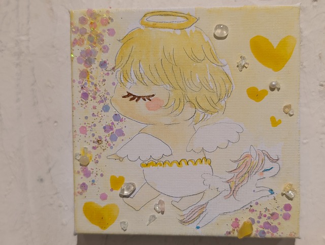 手に収まる可愛いサイズのミニ原画 天使ちゃんとペガサスちゃんが あなたの心を癒してくれる✨ 日々の喧騒から離れ 癒しのひとときをこの子たちとお過ごし下さい あなたが新たなスタートを切るときに サポートしてくれる存在となるでしょう サイズ 7.5cm×7.5cm 水彩絵の具、ラメ