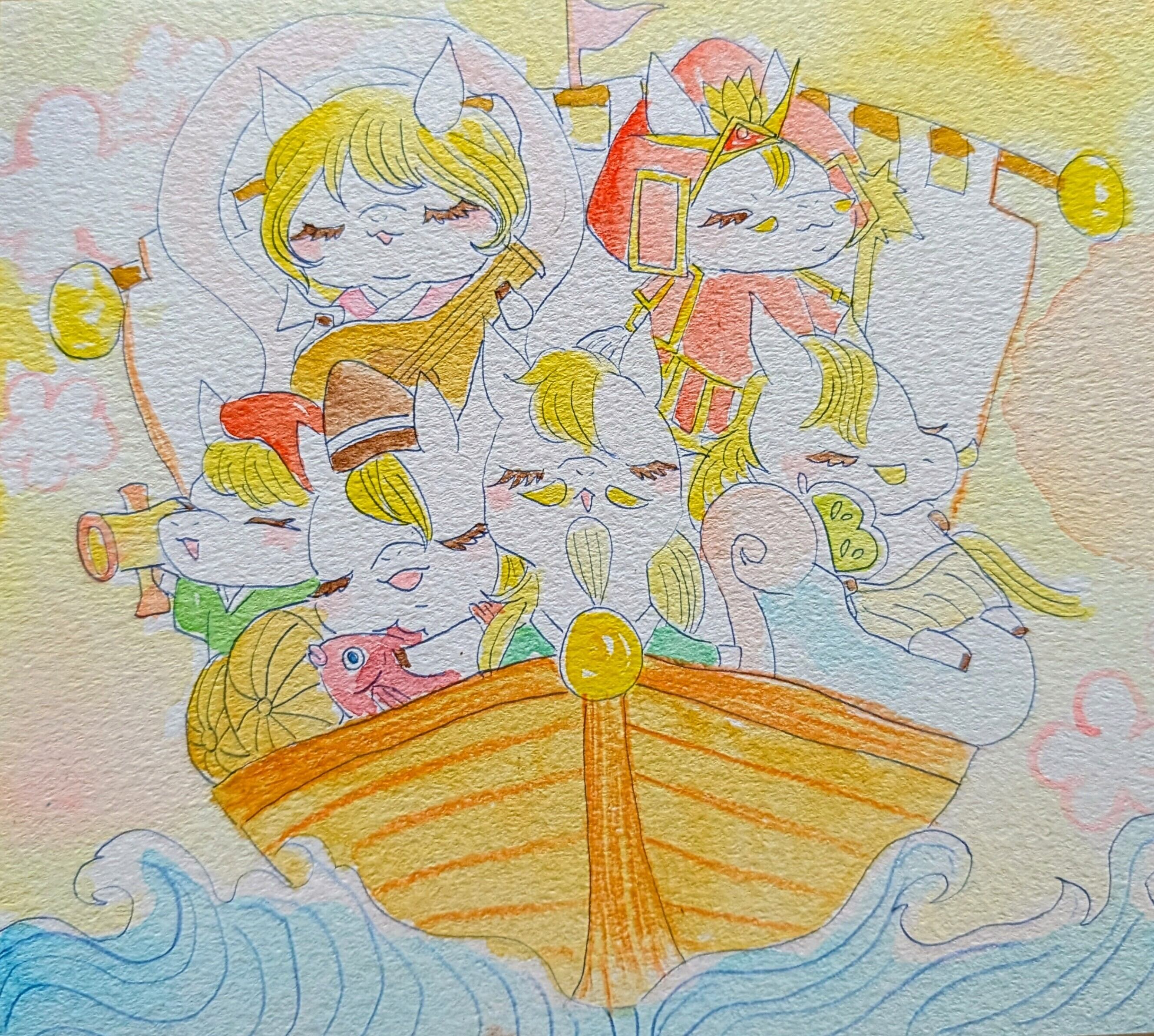 七福神を可愛らしい“馬”として描いた、優しい色合いの原画イラストです。